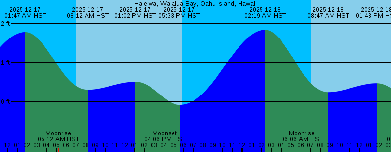 2025-12-17 01:47 AM HST 1.79 feet High Tide 2025-12-17 05:12 AM HST Moonrise 2025-12-17 07:04 AM HST Sunrise 2025-12-17 08:12 AM HST 0.30 feet Low Tide 2025-12-17 01:02 PM HST 0.51 feet High Tide 2025-12-17 04:06 PM HST Moonset 2025-12-17 05:33 PM HST -0.08 feet Low Tide 2025-12-17 05:53 PM HST Sunset 2025-12-18 02:19 AM HST 1.84 feet High Tide 2025-12-18 06:06 AM HST Moonrise 2025-12-18 07:04 AM HST Sunrise 2025-12-18 08:47 AM HST 0.24 feet Low Tide 2025-12-18 01:43 PM HST 0.47 feet High Tide 2025-12-18 04:53 PM HST Moonset 2025-12-18 05:53 PM HST Sunset 2025-12-18 06:06 PM HST -0.11 feet Low Tide 2025-12-19 02:53 AM HST 1.87 feet High Tide 2025-12-19 07:00 AM HST Moonrise 2025-12-19 07:05 AM HST Sunrise 2025-12-19 09:22 AM HST 0.20 feet Low Tide 2025-12-19 02:22 PM HST 0.45 feet High Tide 2025-12-19 03:44 PM HST New Moon 2025-12-19 05:44 PM HST Moonset 2025-12-19 05:54 PM HST Sunset 2025-12-19 06:41 PM HST -0.12 feet Low Tide 2025-12-20 03:28 AM HST 1.88 feet High Tide 2025-12-20 07:05 AM HST Sunrise 2025-12-20 07:52 AM HST Moonrise 2025-12-20 09:58 AM HST 0.18 feet Low Tide 2025-12-20 03:02 PM HST 0.43 feet High Tide 2025-12-20 05:54 PM HST Sunset 2025-12-20 06:38 PM HST Moonset 2025-12-20 07:16 PM HST -0.12 feet Low Tide |