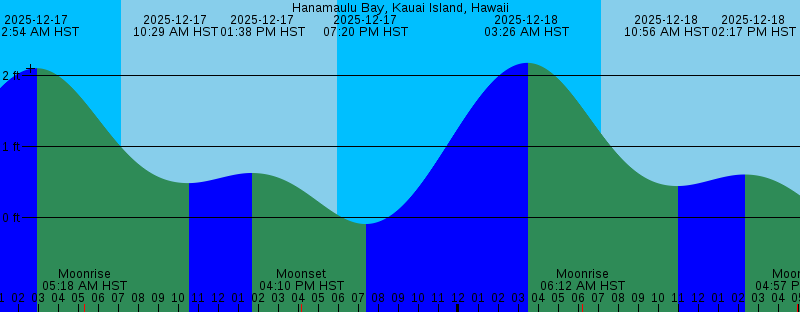2025-12-17 07:09 AM HST Sunrise 2025-12-17 10:29 AM HST 0.49 feet Low Tide 2025-12-17 01:38 PM HST 0.63 feet High Tide 2025-12-17 04:10 PM HST Moonset 2025-12-17 05:57 PM HST Sunset 2025-12-17 07:20 PM HST -0.09 feet Low Tide 2025-12-18 03:26 AM HST 2.18 feet High Tide 2025-12-18 06:12 AM HST Moonrise 2025-12-18 07:10 AM HST Sunrise 2025-12-18 10:56 AM HST 0.45 feet Low Tide 2025-12-18 02:17 PM HST 0.61 feet High Tide 2025-12-18 04:57 PM HST Moonset 2025-12-18 05:57 PM HST Sunset 2025-12-18 07:56 PM HST -0.11 feet Low Tide 2025-12-19 03:59 AM HST 2.22 feet High Tide 2025-12-19 07:06 AM HST Moonrise 2025-12-19 07:10 AM HST Sunrise 2025-12-19 11:23 AM HST 0.43 feet Low Tide 2025-12-19 02:52 PM HST 0.61 feet High Tide 2025-12-19 03:44 PM HST New Moon 2025-12-19 05:48 PM HST Moonset 2025-12-19 05:58 PM HST Sunset 2025-12-19 08:32 PM HST -0.12 feet Low Tide 2025-12-20 04:33 AM HST 2.23 feet High Tide 2025-12-20 07:11 AM HST Sunrise 2025-12-20 07:58 AM HST Moonrise 2025-12-20 11:53 AM HST 0.42 feet Low Tide 2025-12-20 03:27 PM HST 0.61 feet High Tide 2025-12-20 05:58 PM HST Sunset 2025-12-20 06:42 PM HST Moonset 2025-12-20 09:09 PM HST -0.12 feet Low Tide 2025-12-21 05:07 AM HST 2.21 feet High Tide |