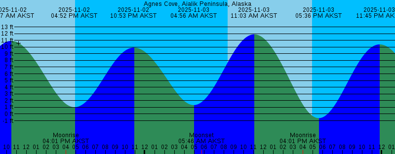 2025-11-02 08:23 AM AKST Sunrise 2025-11-02 10:27 AM AKST 10.91 feet High Tide 2025-11-02 04:01 PM AKST Moonrise 2025-11-02 04:52 PM AKST 1.02 feet Low Tide 2025-11-02 04:59 PM AKST Sunset 2025-11-02 10:53 PM AKST 9.92 feet High Tide 2025-11-03 04:56 AM AKST 1.33 feet Low Tide 2025-11-03 05:46 AM AKST Moonset 2025-11-03 08:26 AM AKST Sunrise 2025-11-03 11:03 AM AKST 11.89 feet High Tide 2025-11-03 04:01 PM AKST Moonrise 2025-11-03 04:56 PM AKST Sunset 2025-11-03 05:36 PM AKST -0.61 feet Low Tide 2025-11-03 11:45 PM AKST 10.39 feet High Tide 2025-11-04 05:38 AM AKST 1.32 feet Low Tide 2025-11-04 07:35 AM AKST Moonset 2025-11-04 08:28 AM AKST Sunrise 2025-11-04 11:40 AM AKST 12.72 feet High Tide 2025-11-04 04:03 PM AKST Moonrise 2025-11-04 04:54 PM AKST Sunset 2025-11-04 06:19 PM AKST -1.91 feet Low Tide 2025-11-05 12:36 AM AKST 10.70 feet High Tide 2025-11-05 04:20 AM AKST Full Moon 2025-11-05 06:20 AM AKST 1.52 feet Low Tide 2025-11-05 08:31 AM AKST Sunrise 2025-11-05 09:32 AM AKST Moonset 2025-11-05 12:19 PM AKST 13.30 feet High Tide 2025-11-05 04:07 PM AKST Moonrise 2025-11-05 04:51 PM AKST Sunset 2025-11-05 07:02 PM AKST -2.71 feet Low Tide 2025-11-06 01:26 AM AKST 10.77 feet High Tide |