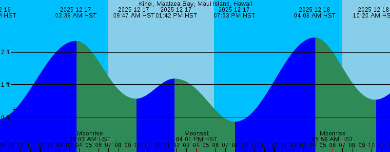 2025-12-17 03:38 AM HST 2.35 feet High Tide 2025-12-17 05:03 AM HST Moonrise 2025-12-17 06:55 AM HST Sunrise 2025-12-17 09:47 AM HST 0.57 feet Low Tide 2025-12-17 01:42 PM HST 1.19 feet High Tide 2025-12-17 04:01 PM HST Moonset 2025-12-17 05:48 PM HST Sunset 2025-12-17 07:53 PM HST -0.14 feet Low Tide 2025-12-18 04:08 AM HST 2.45 feet High Tide 2025-12-18 05:58 AM HST Moonrise 2025-12-18 06:56 AM HST Sunrise 2025-12-18 10:20 AM HST 0.54 feet Low Tide 2025-12-18 02:20 PM HST 1.17 feet High Tide 2025-12-18 04:48 PM HST Moonset 2025-12-18 05:48 PM HST Sunset 2025-12-18 08:26 PM HST -0.18 feet Low Tide 2025-12-19 04:40 AM HST 2.51 feet High Tide 2025-12-19 06:51 AM HST Moonrise 2025-12-19 06:57 AM HST Sunrise 2025-12-19 10:52 AM HST 0.52 feet Low Tide 2025-12-19 02:55 PM HST 1.16 feet High Tide 2025-12-19 03:44 PM HST New Moon 2025-12-19 05:39 PM HST Moonset 2025-12-19 05:49 PM HST Sunset 2025-12-19 08:59 PM HST -0.21 feet Low Tide 2025-12-20 05:13 AM HST 2.54 feet High Tide 2025-12-20 06:57 AM HST Sunrise 2025-12-20 07:43 AM HST Moonrise 2025-12-20 11:25 AM HST 0.51 feet Low Tide 2025-12-20 03:29 PM HST 1.15 feet High Tide 2025-12-20 05:49 PM HST Sunset 2025-12-20 06:34 PM HST Moonset |