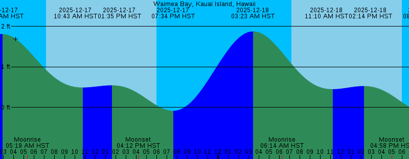 2025-12-17 02:51 AM HST 1.81 feet High Tide 2025-12-17 05:19 AM HST Moonrise 2025-12-17 07:11 AM HST Sunrise 2025-12-17 10:43 AM HST 0.49 feet Low Tide 2025-12-17 01:35 PM HST 0.54 feet High Tide 2025-12-17 04:12 PM HST Moonset 2025-12-17 05:58 PM HST Sunset 2025-12-17 07:34 PM HST -0.09 feet Low Tide 2025-12-18 03:23 AM HST 1.88 feet High Tide 2025-12-18 06:14 AM HST Moonrise 2025-12-18 07:11 AM HST Sunrise 2025-12-18 11:10 AM HST 0.45 feet Low Tide 2025-12-18 02:14 PM HST 0.52 feet High Tide 2025-12-18 04:58 PM HST Moonset 2025-12-18 05:59 PM HST Sunset 2025-12-18 08:10 PM HST -0.11 feet Low Tide 2025-12-19 03:56 AM HST 1.91 feet High Tide 2025-12-19 07:08 AM HST Moonrise 2025-12-19 07:12 AM HST Sunrise 2025-12-19 11:37 AM HST 0.43 feet Low Tide 2025-12-19 02:49 PM HST 0.52 feet High Tide 2025-12-19 03:44 PM HST New Moon 2025-12-19 05:49 PM HST Moonset 2025-12-19 05:59 PM HST Sunset 2025-12-19 08:46 PM HST -0.12 feet Low Tide 2025-12-20 04:30 AM HST 1.91 feet High Tide 2025-12-20 07:12 AM HST Sunrise 2025-12-20 07:59 AM HST Moonrise 2025-12-20 12:07 PM HST 0.42 feet Low Tide 2025-12-20 03:24 PM HST 0.53 feet High Tide 2025-12-20 06:00 PM HST Sunset 2025-12-20 06:44 PM HST Moonset 2025-12-20 09:23 PM HST -0.12 feet Low Tide |